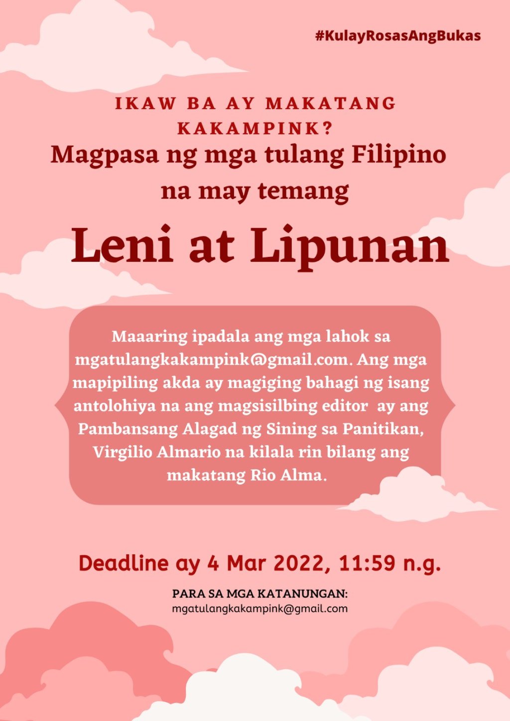 Maaaring ipadala ang mga tulang pasók sa paksang Leni at Lipunan sa mgatulangkakampink@gmail.com. Ang mga mapipiling akda ay magiging bahagi ng antolohiya na ang magsisilbing editor ay ang Pambansang Alagad ng Sining sa Panitikan, Virgilio Almario na kilala rin bilang ang makatang Rio Alma.